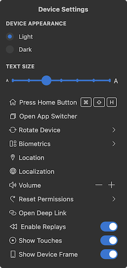 Device settings - allows to adjust the device settings like device appearance, location, permissions, and text size.