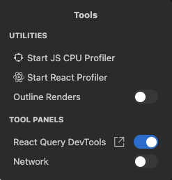 Dev Tools - allows to launch various Dev Tools like React Query, Redux, Network inside the editor panel.