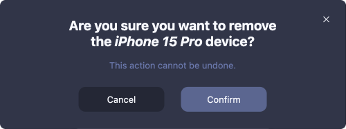 Clicking the delete icon in the manage devices modal will ask if you really want to delete this device. A deleted device cannot be restored. If you want to have the same device you deleted, you have to create it again.